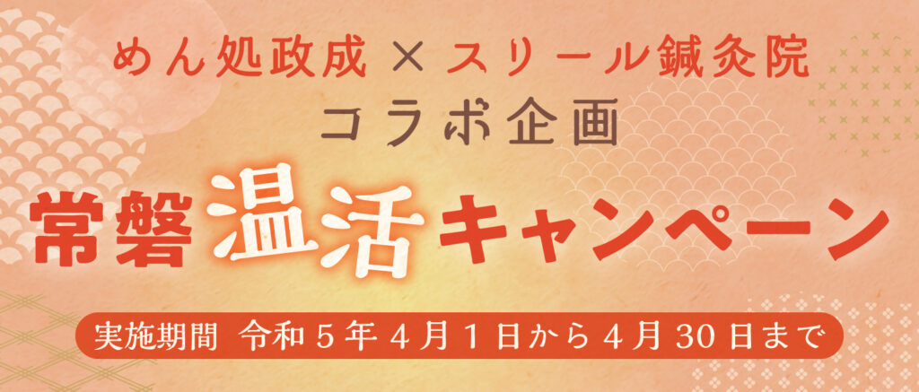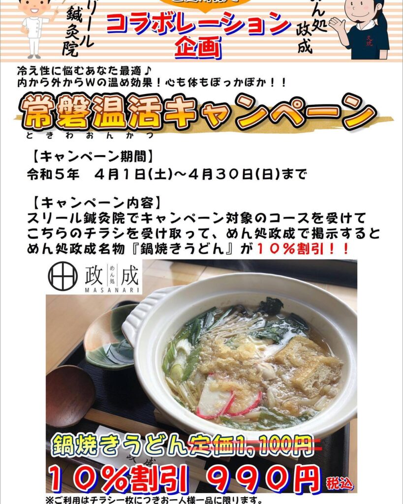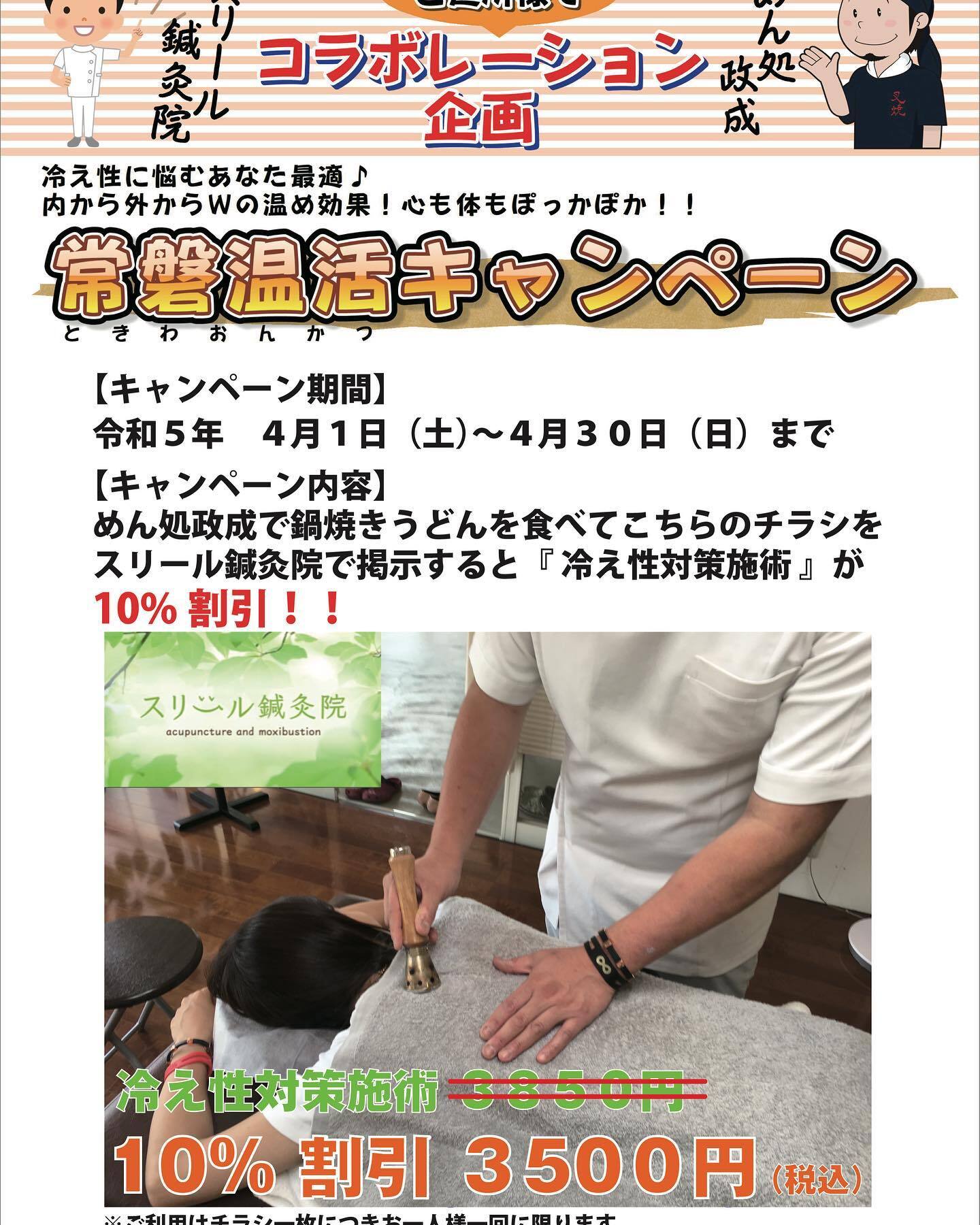 まだまだ、朝晩の寒さが続くので、体をしっかり温めて、心も体もぽっかぽかに「めん処政成でスリール鍼灸院のチラシ」を「スリール鍼灸院で政成のチラシ」を貰って来店すると10%引きで食べれたり、受けれたりします♪