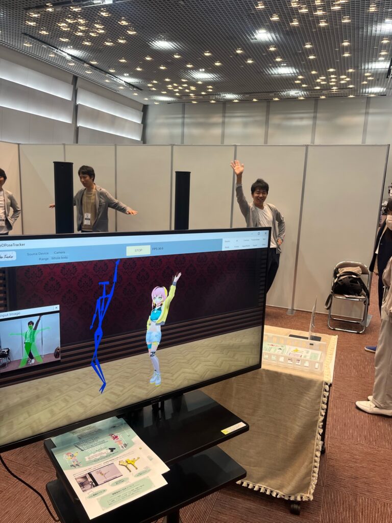 当初私がイメージしていたのは、VRゴーグルを使用した仮想体験が主体となった展示だろうと考えていましたが、会場内で展示されていたものは、想像していたものよりも未来で使われるような技術の連続で、モーションキャプチャー用の機材を使わずにリアルタイムでパソコン上のキャラクターを動かすことができ、気軽にVTuberになれる体験や、ゴーグルに映し出される映像にリンクして動く椅子に座り、東北地方太平洋沖地震の疑似体験ができるブース、専用のグローブをはめて、現実世界では触れることができないものを触る体験等、驚きと発見の連続でした。