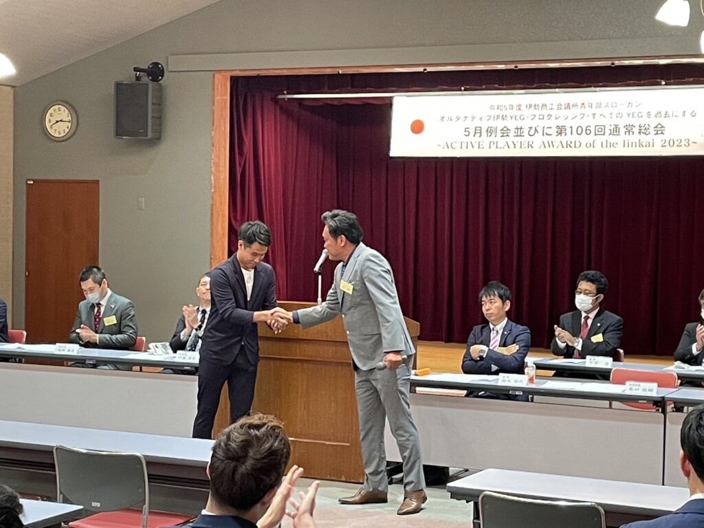 その後、総会により引き締まっていた空気も穏やかに、前年度事業活動における各委員会功績者の表彰と、再入会を果たした委員への表彰が笑顔あふれる中で行われました。また一身上の都合から一度退会を余儀なくする委員へ、東口直前会長が先の再会を願い固い握手を交わす一面も見られ、無事に閉会へと至りました。
