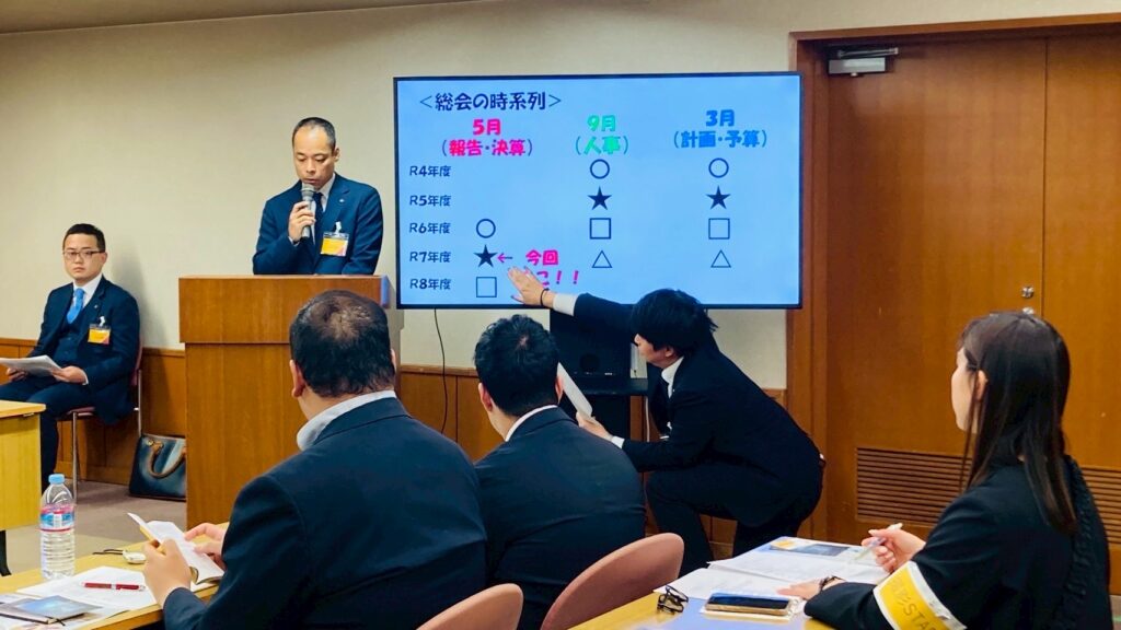 総会という非常に大切な物事を決める場の運営担当をする中で、当日の設営や解説する内容に関して